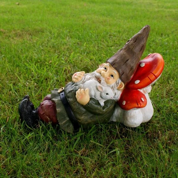 Genietend van zijn middagdutje op de paddestoelen is deze tuinkabouter een originele tuindecoratie voor het hele gezin.