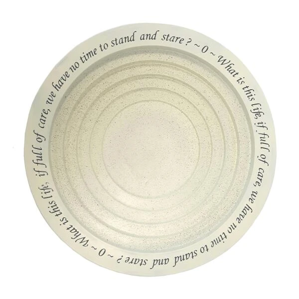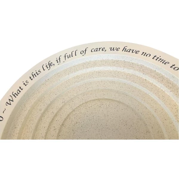 Het bad is gemaakt uit het composietmateriaal polyboo en wordt geleverd met een lage voet. Op de rand is een spreuk gegraveerd ‘What is this life, if full of care, we have no time to stand and stare‘.